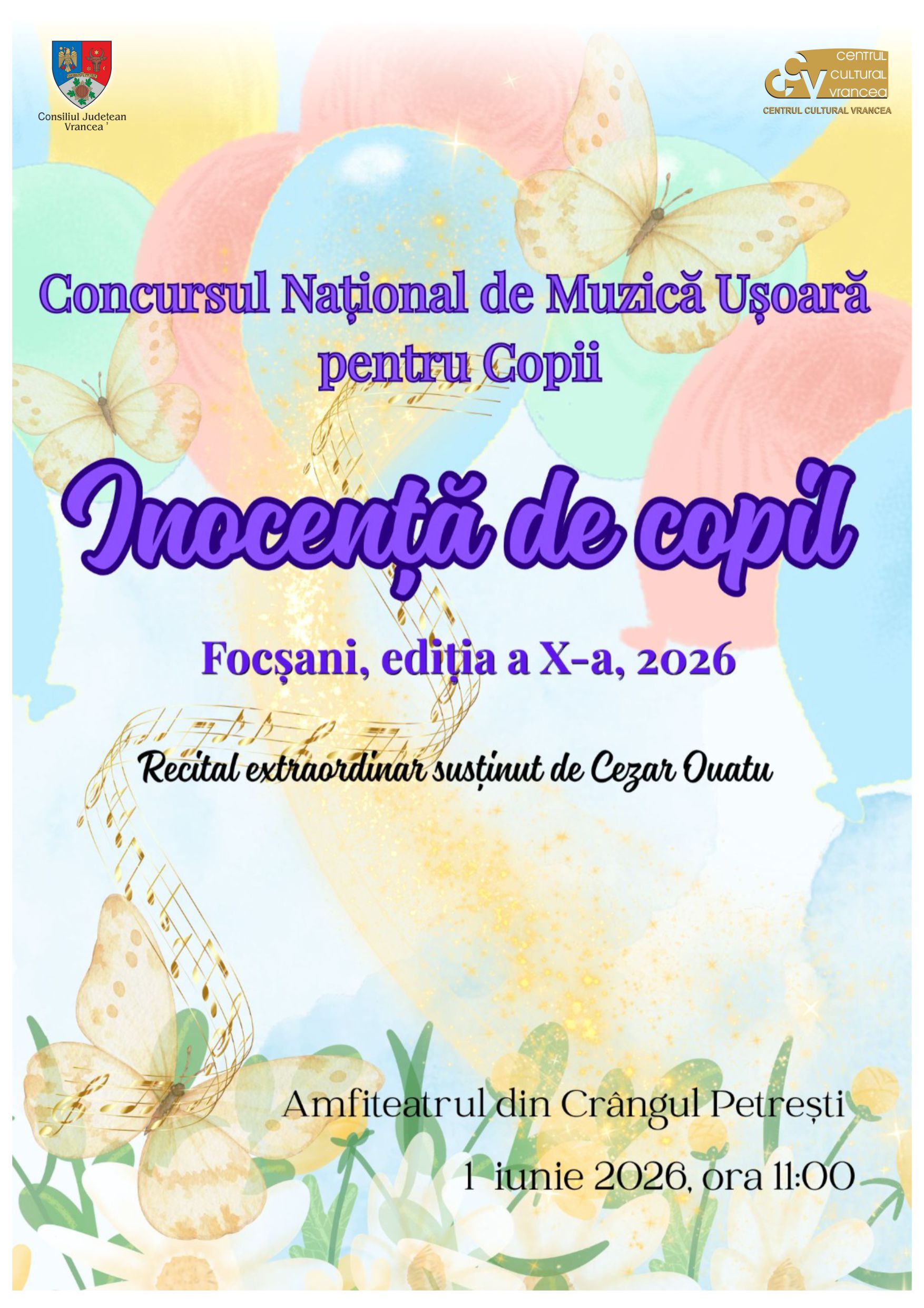 Consiliul Județean Vrancea, prin Centrul Cultural Vrancea, organizează pe, 1 iunie 2026, ora 11.00, în Amfiteatrul Crângului Petrești, Concursul Naţional de Muzică Uşoară pentru Copii, Inocenţă de copil, ediția a X-a.